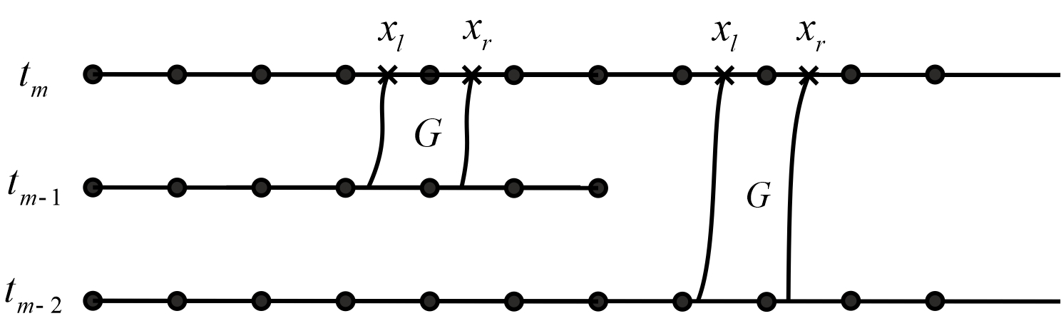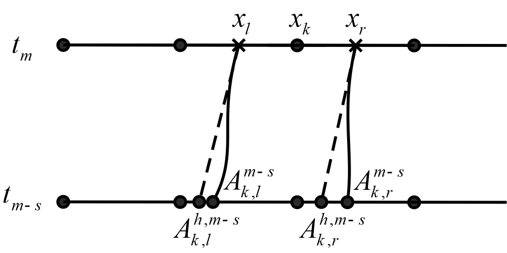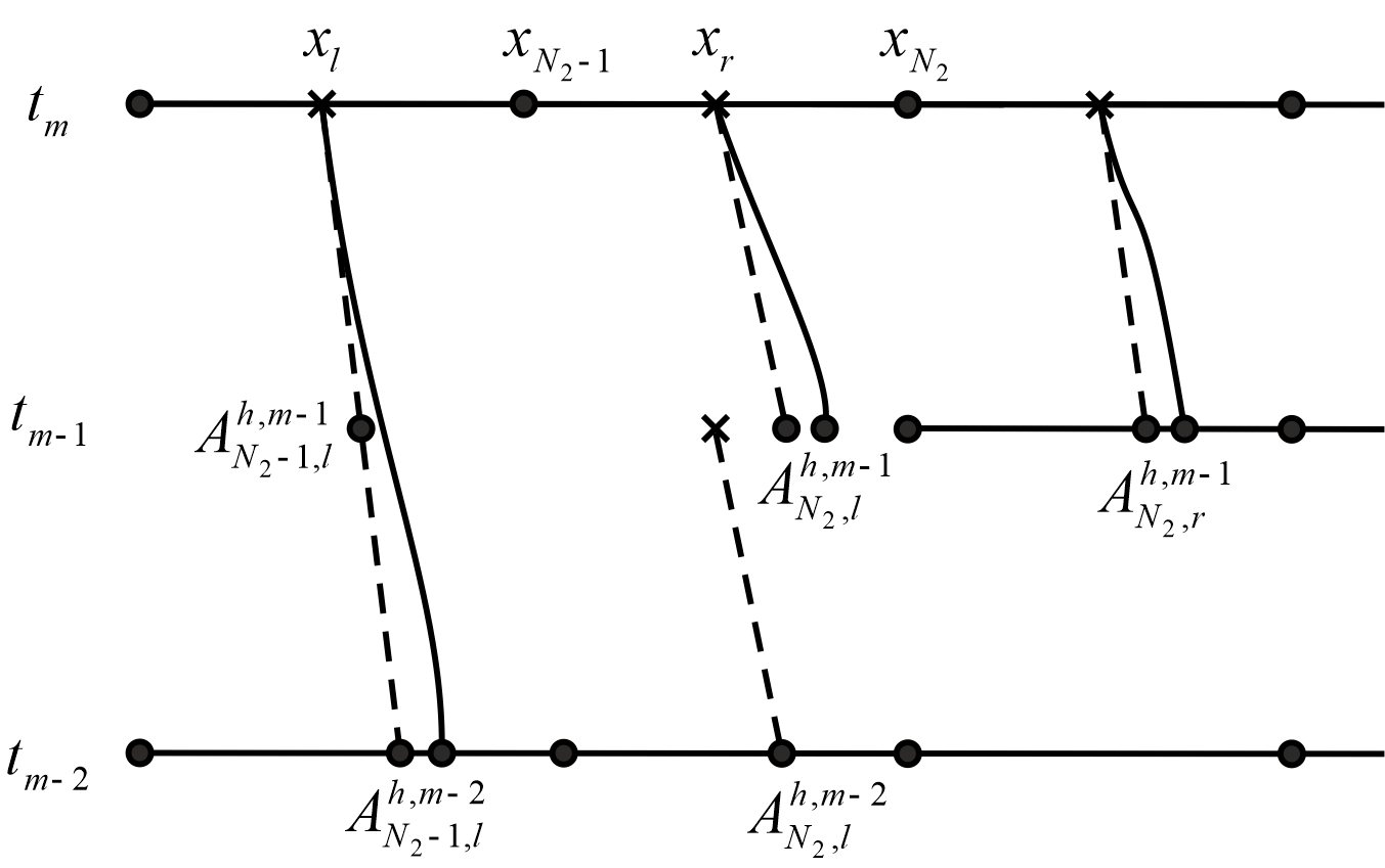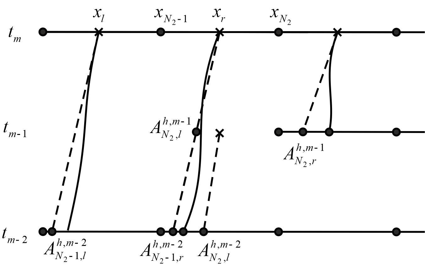 Рассмотрим узел при и . В этом случае узел является внутренним узлом сетки или сетки . Обозначим и – две точки, которые являются границами множества на слое по времени . Для каждой из этих точек в плоскости построим обратно по времени со слоя на слой характеристическую траекторию ,(1). Здесь , если , и , если (рис. 2). Каждая траектория является решением задачи Коши для обыкновенного дифференциального уравнения