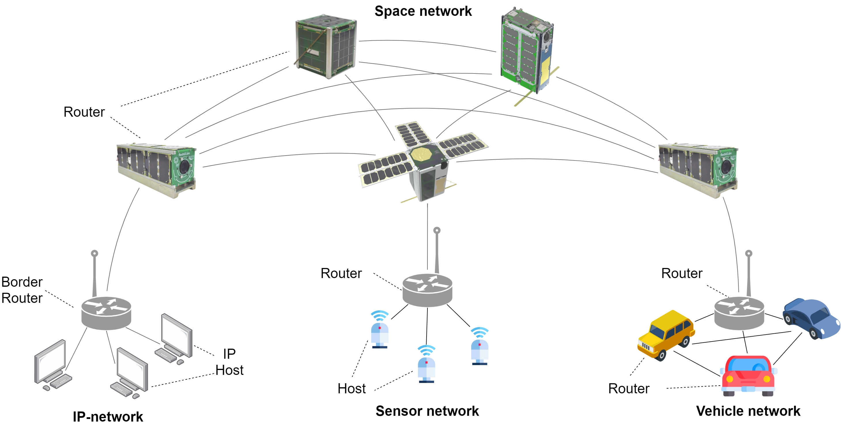 Сетевая архитектура подразумевает наличие как минимум наземного и космического сегмента. Узлы космического сегмента – МКА на низких околоземных орбитах. Наземный сегмент может быть представлен привычными сетями (Ethernet, Wi-Fi, WiMAX, Bluetooth и т. д.), сетями интернета вещей (Internet of Things, IoT) [3] или интернета транспортных средств, как это представлено в работе [4].