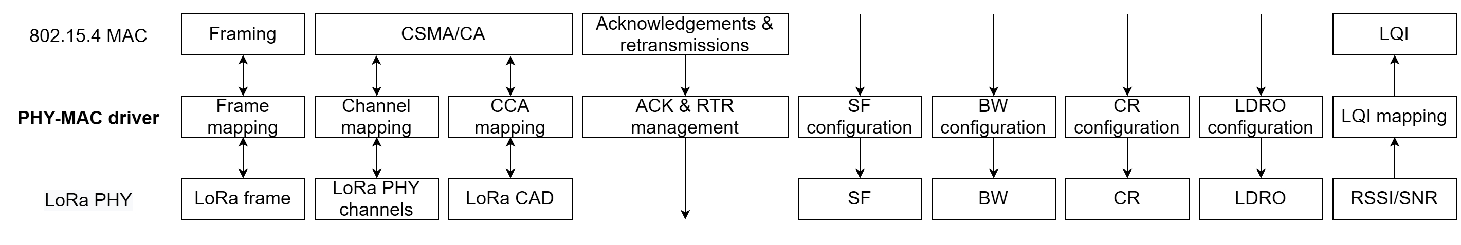 Основные аппаратные функции, реализованные в стандарте 802.15.4, имеют аналогичные в стандарте LoRa, за исключением обнаружения активного канала. Однако, если канал один, это не представляется критичным. В противном случае, можно рассмотреть механизмы переключения канала на более высоком уровне.