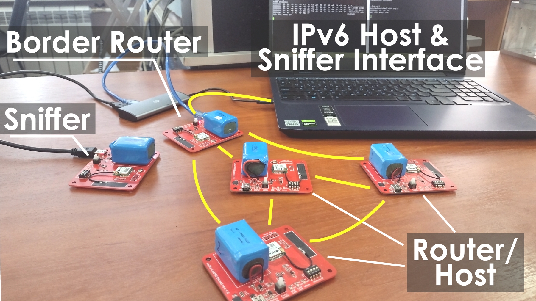 Здесь три узла могут выполнять функции маршрутизатора или конечного узла: один узел – граничный маршрутизатор, один узел – сетевой сниффер, позволяющий перехватывать пакеты, передаваемые между платами. К граничному маршрутизатору подключен IPv6 узел. К этому же узлу подключен сниффер, чтобы обеспечить интерфейс.