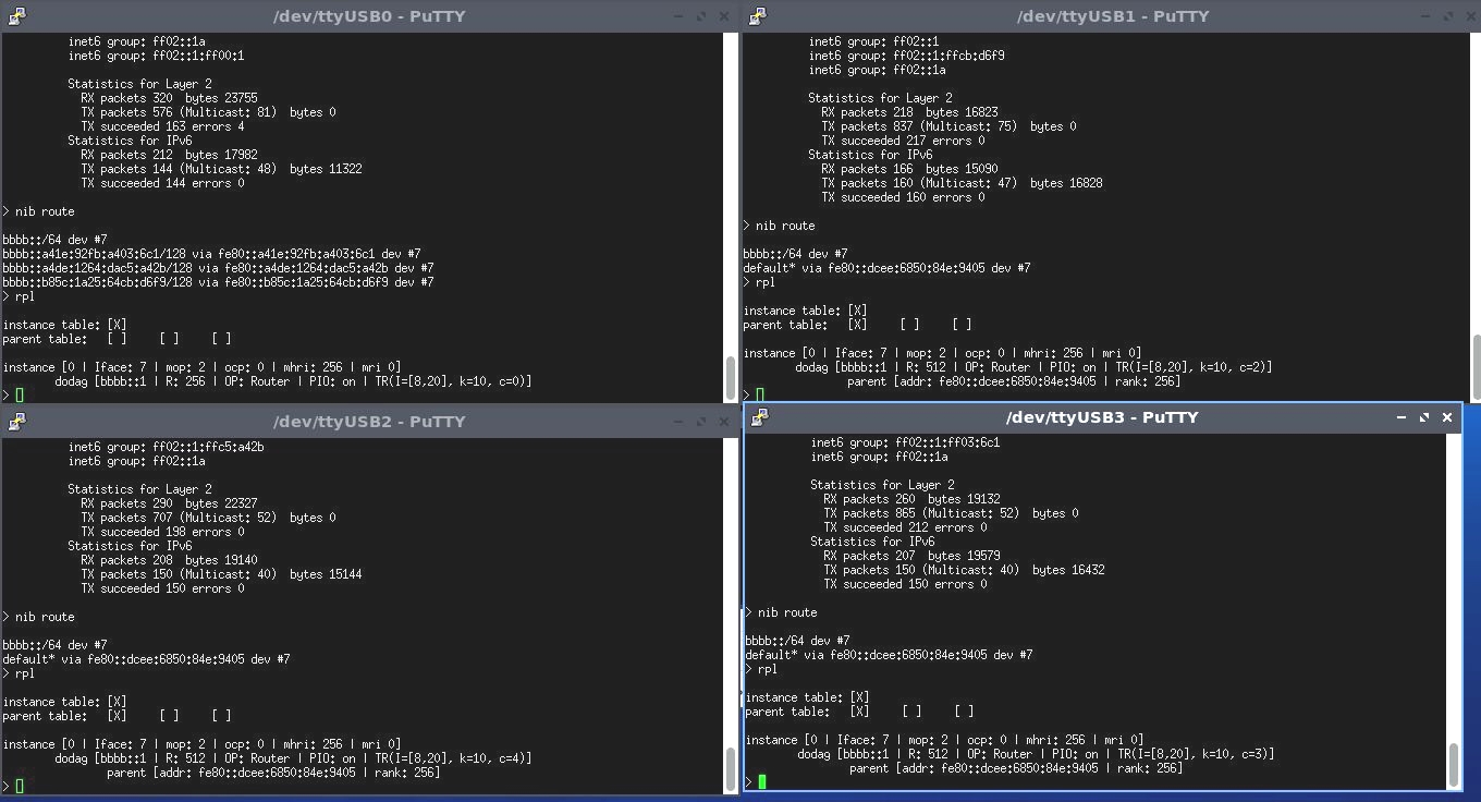 На рис. 5 приведен пример инициализации устройств. Для каждого из четырех активных узлов выводится список соседних узлов (ND) и таблица маршрутизации (RPL). Граничный маршрутизатор (подключенный как /dev/ttyUSB0) выполняет функции корневого. Можно увидеть, что узлы, по-умолчанию, образуют топологию DODAG (Destination Oriented Directed Acyclic Graph). Дочерние узлы находятся в непосредственной близости к корневому маршрутизатору и, таким образом, автоматически относятся к первому уровню графа, что отмечено символом «Х» в графе «parent table». Это говорит о том, что предложенное решение является вполне жизнеспособным: операционная система и, в том числе, сетевой стек функционируют в необходимом объеме.