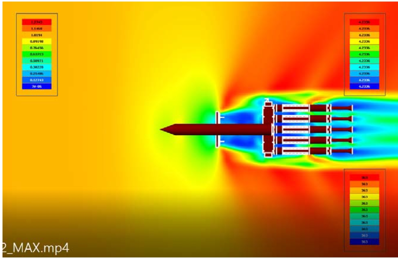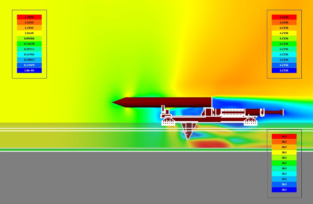 На рис. 2–4 справа внизу представлены значения скорости воздушного потока при обтекании элементов конструкции ракетной каретки в м/с, а слева вверху – в числах М. Видна сложная картина интерференции скачков уплотнений, отраженных от элементов конструкции каретки и полотна рельсового трека. Для различных режимов движения получены численные значения газодинамических сил, моментов и распределения параметров давления, плотности, температуры.