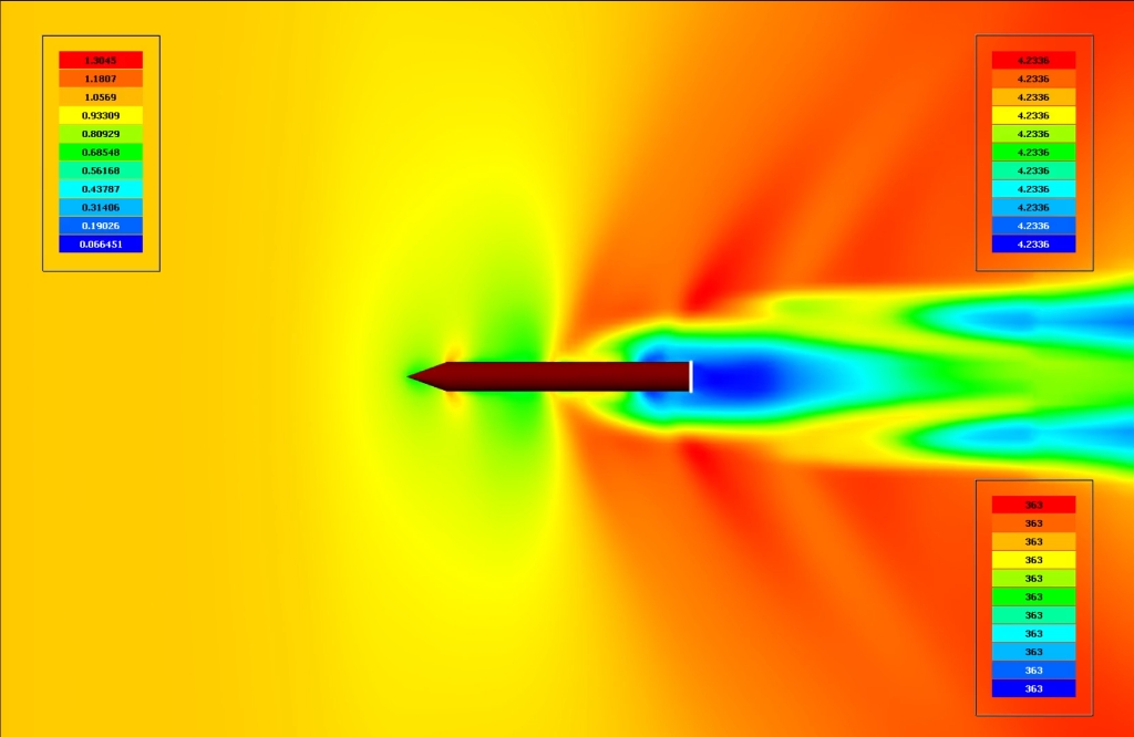 Рис. 3. Вид сверху. Картина обтекания модели воздушным потоком со скоростью 363 м/с. Уровень объекта испытания
