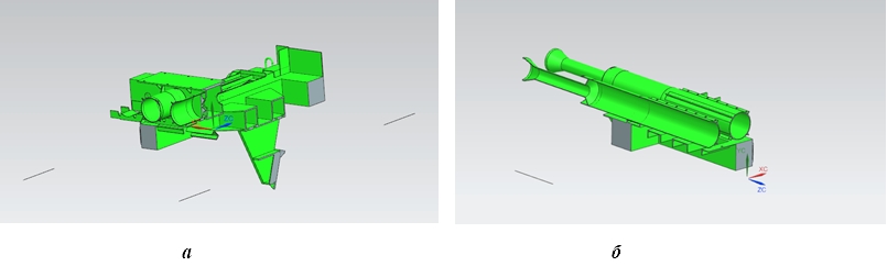 Fig. 5. Breakdown elements of the 3D track sled model: a – block of the right quarter of the model, including the front and middle beams, as wellas a bucket for hydrodynamic braking of the sled; b – block of the right quarter of the model, including the middle and rear beams of the sled and solid propellant rocket motor