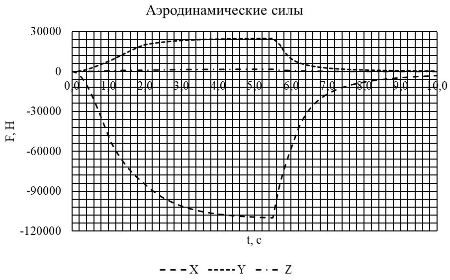 Рис. 7. Силы аэродинамического сопротивления, действующие по направлениям осей X, Y, Z