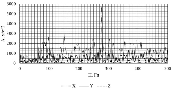 По оси Х виброускорения с большими значениями соответствуют собственным частотам. Так, АR = 300 g при частоте f = 150 Гц; АR = 580 g при частоте f = 277 Гц. По оси Y виброускорения относительно невелики и не превышают 100 g в широкой полосе частот.