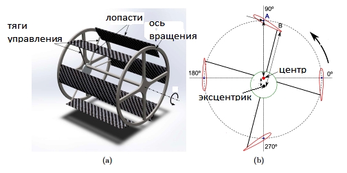 В целом крыльчатый движитель представляет собой устройство по созданию подъемной и тяговой сил летательного аппарата. Он конструктивно выглядит как цилиндрический ротор, по окружности которого на равных угловых расстояниях расположены крылообразные лопасти, которые совершают круговые движения вместе с ротором и колебательные движения вокруг собственных осей, лежащих на цилиндрической поверхности ротора. Сами колебательные движения лопастей по циклу вращения ротора задаются эксцентриковым механизмом и передаются системой управления (рис. 1). Вращение ротора приводится внешним двигателем [6].