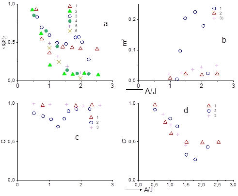 Рис. 3. Зависимость спиновых корреляционных функций < S0Sr > на r =1(1.56) и r =10(2,3,4), а также термодинамических характеристик σ и q в двухмерном АФМ с четырехспиновым обменом и анизотропией d = 1, А/J =1,25 (3) , А/J = 1,75 (2) , d = 10 , А/J =1,5 (1)