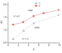 Коллинеарное АФМ упорядочение при усилении константы четырехспинового обмена заменяется неколлинеарным НАФ, имеющим спонтанный момент вдоль легкой оси. Зависимость спиновых корреляционных функций от расстояния имеет слабо затухающий осциллирующий характер (рис. 1). В области перехода АФМ – НАФ ближний антиферромагнитный порядок заменяется ферромагнитным на расстоянии r = 1 при сохранении дальнего антиферромагнитного порядка. Внутренняя энергия уменьшается с ростом константы А в результате конкуренции билинейного и четырехспинового обменных взаимодействий. Фазовая диаграмм-ма магнетика с четырехспиновым обменом, вычисленная методом МК на квадратной и кубической решетке, изображена на рис. 2 на плоскости четырехспиновый обмен – одноосная анизотропия.