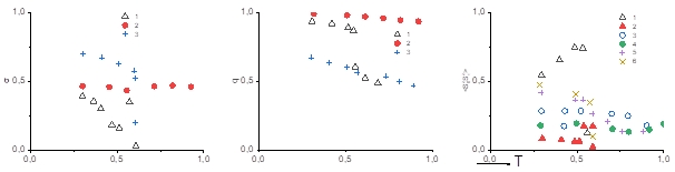 Рассмотрим двумерный анизотропный АФМ с негейзенберговским обменом во всей области параметром А и D. В коллинеарном АФМ с четырехспиновым обменом при А < А1 существует обычный фазовый переход второго рода по подрешеточной намагниченности, квадрупольному параметру и спиновым корреляционным функциям (рис. 3). В неколлинеарном АФМ со спонтанным моментом наблюдается ориентационный переход по спонтанному моменту из базисной плоскости вдоль легкой оси анизотропии, подрешеточные положительные спиновые корреляционные функции увеличиваются по сравнению с отрицательными. Дальнейшее повышение температуры разрушает дальний магнитный порядок и наблюдается фазовый переход «порядок – чужой беспорядок», который характеризуется несовпадением векторов дальнего и ближнего порядка ниже и выше точки перехода. Такие переходы наиболее ярко выражены в НАФ с четырехспиновым взаимодействием и со спонтанным моментом (рис. 3). Вектор ближнего порядка выше температуры Нееля равен , в то время как вектор дальнего порядка имеет максимум интенсивности в центре зоны (0, 0, 0). Смена знака вектора ближнего порядка весьма существенно может отразиться на парамагнитной восприимчивости, электрических и оптических свойствах магнетика. По-видимому, в этой области параметров анизотропии D и четырехспинового обмена A в неколлинеарном АФМ фазовый переход имеет характер I-го рода. Подрешеточная намагниченность, квадрупольный параметров (рис. 3) меняются от температуры скачком и использования в процедуре МК двух исходных конфигураций – АФМ и случайной, что приводит в окрестности фазового перехода к гистерезисным явлениям, которые не наблюдаются в чистом гейзенбертовском магнетике.