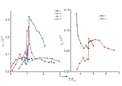 Fig. 4. Temperature dependences of the longitudinal and transverse susceptibility AFM with multiparticle exchange d = 1, А/J =1 (1), 1,75 (2) and Heisenberg’s d = 10 (4), d = 0,1 (3)