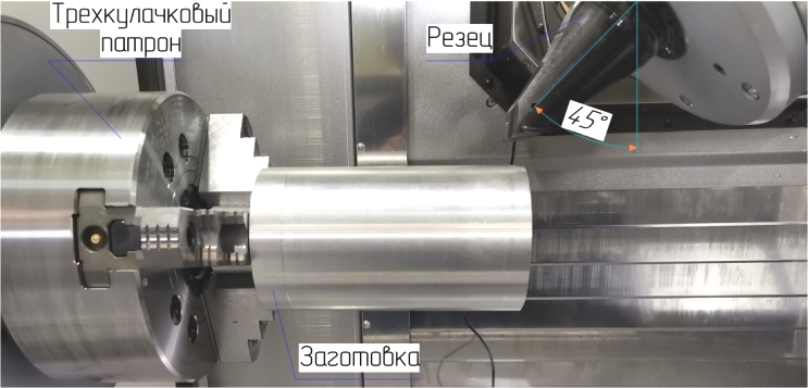 Обработка проводилась с использованием продольной подачи резца. Стратегия задана стандартным циклом чернового наружного точения. Резец имеет нейтральную ориентацию и для предотвращения столкновений рабочих органов станка установлен в позицию «45º» от вертикально оси «X» станка (рис. 4). Подача смазочно-охлаждающих технологических сред осуществлялась под давлением по внутренним каналам инструмента.