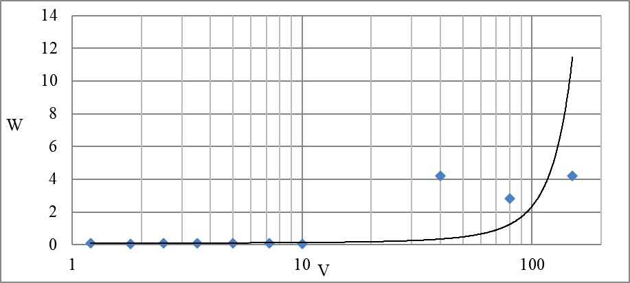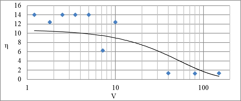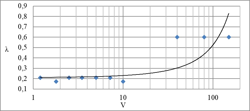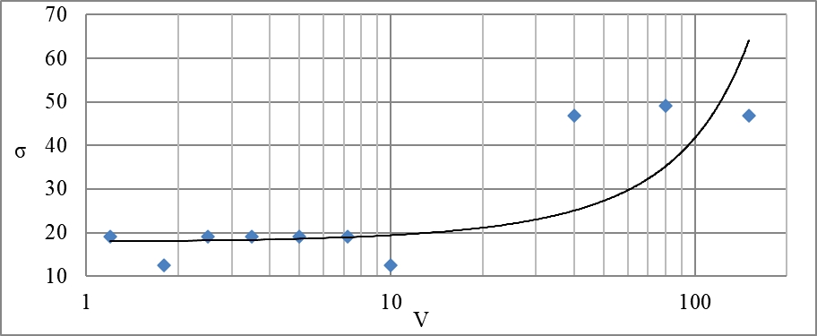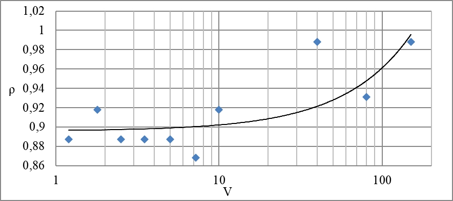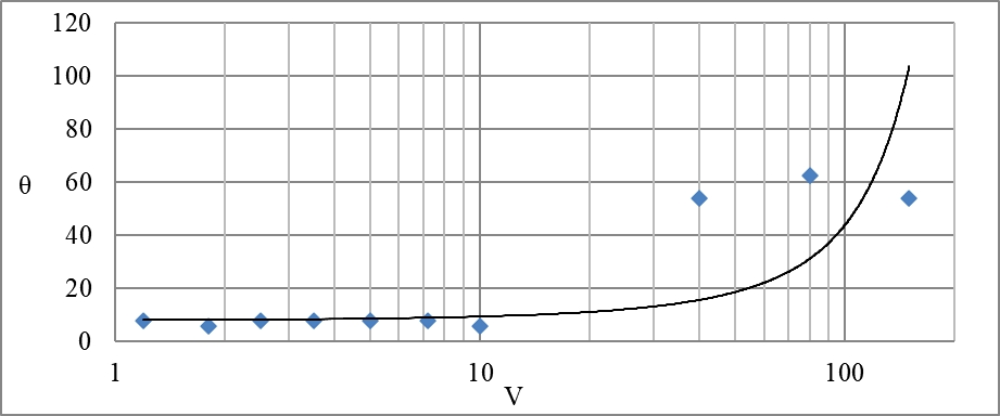 Проведен регрессионный анализ полученных данных, согласно формуле (2), и получены коэффициенты регрессии. Интерпретация зависимостей сил резания от параметров резания (формула (1)) позволила составить регрессионные зависимости выбора физико-химических параметров СОТС (вязкость кинематическая ν; плотность ρ; проникающая способность W; поверхностное натяжение σ; краевой угол θ; коэффициент теплопроводности λ). Основная зависимость выбора технологических сред представлена в виде уравнений: ν = f(V) ρ = f(V), W = f(V), σ = f(V), θ = f(V), λ = f(V). По полученным зависимостям построены точечные графики, по оси «X» нанесены физико-химические свойства СОТС, по оси «Y» скорость резания (рис. 13–18). Кривая, приближенно описывающая характер построения точек, является логарифмической кривой первой степени.