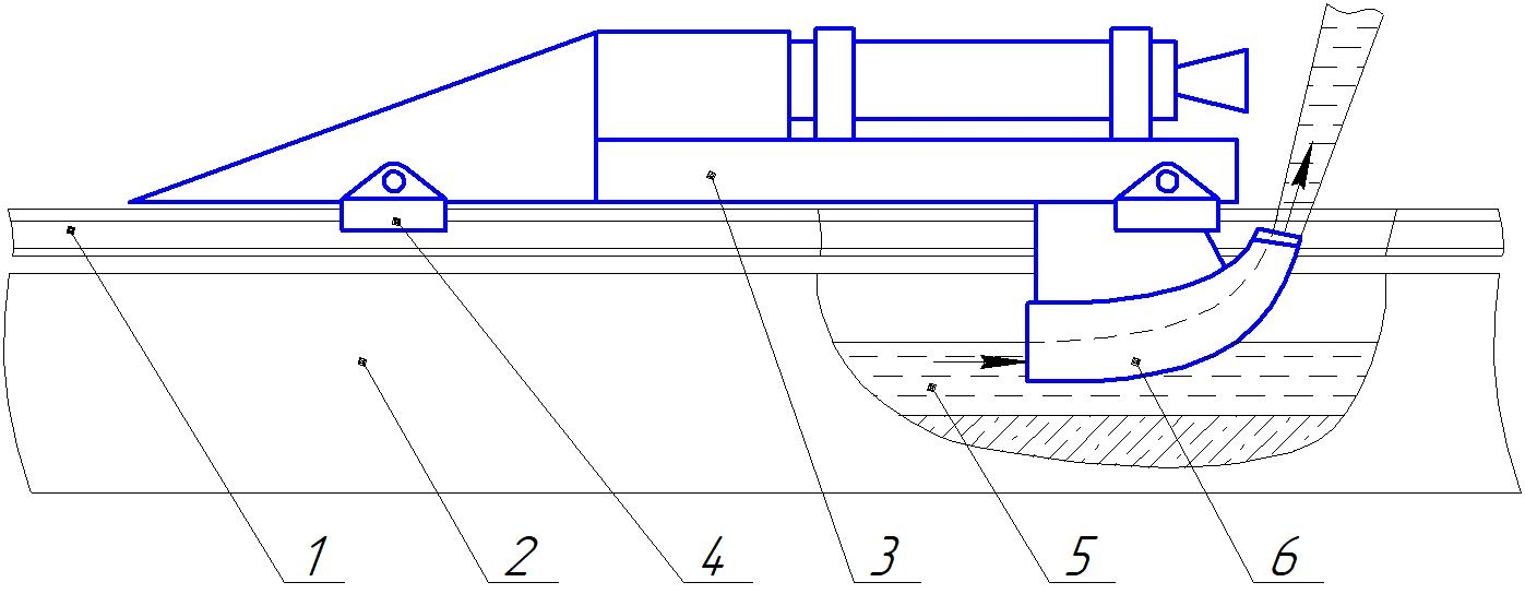 Рис. 2. Схема работы гидродинамического тормозного устройства второго типа: 1 – рельсовая направляющая; 2 – железобетонное основание; 3 – ракетная каретка; 4 – башмак; 5 – вода; 6 – тормозное устройство