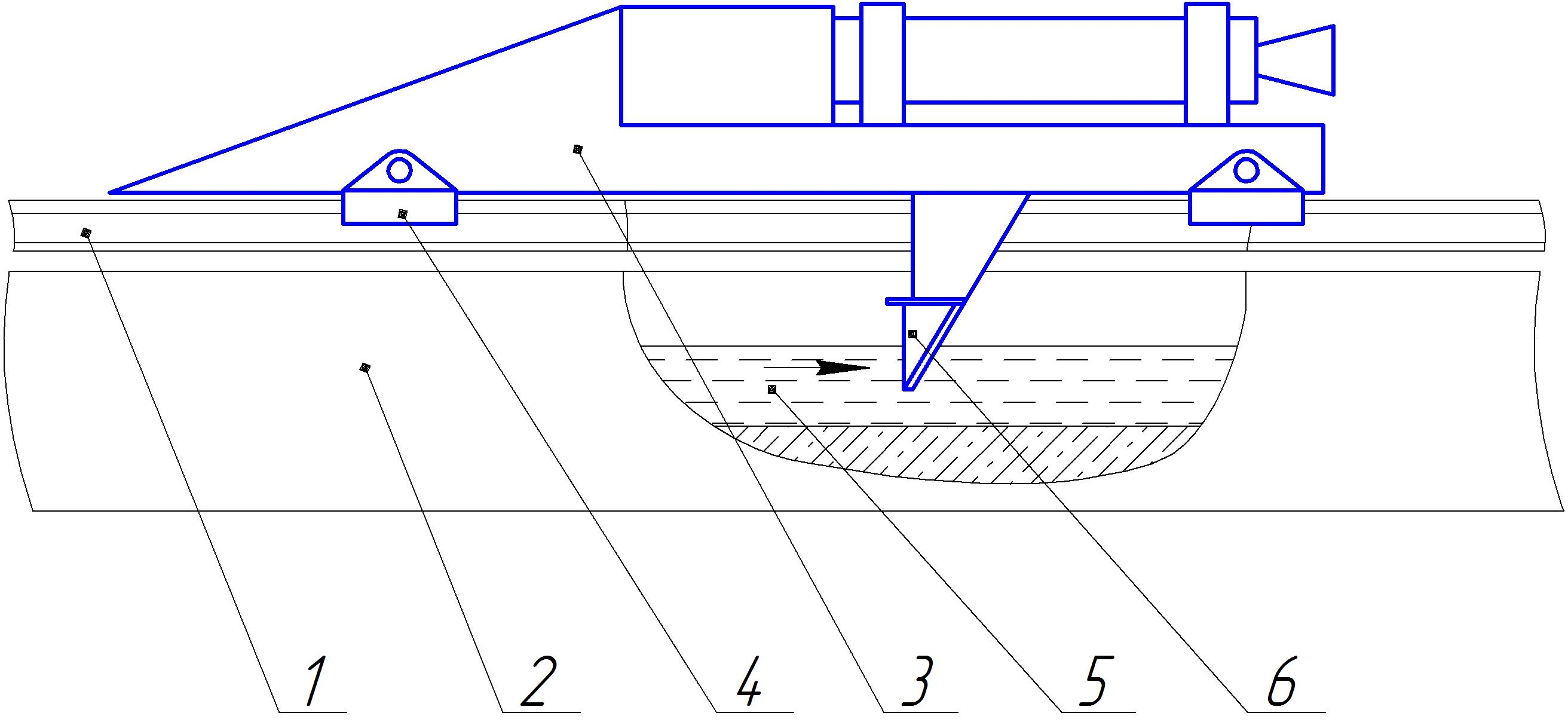 Fig. 2. Scheme of operation of the hydrodynamic braking device of the second type: 1 – rail guide; 2 – reinforced concrete base; 3 – rocket sled; 4 – slipper; 5 – water; 6 – braking device