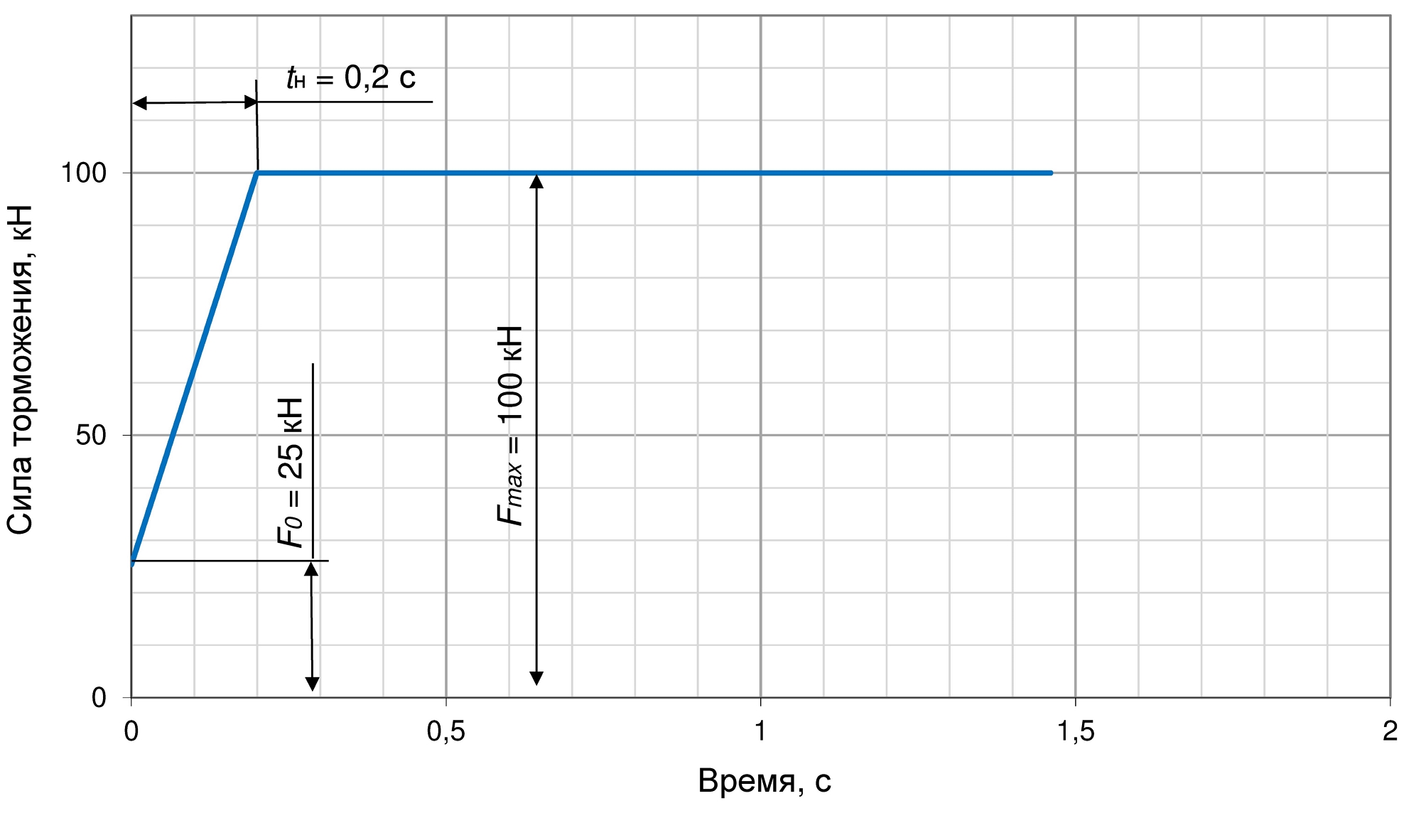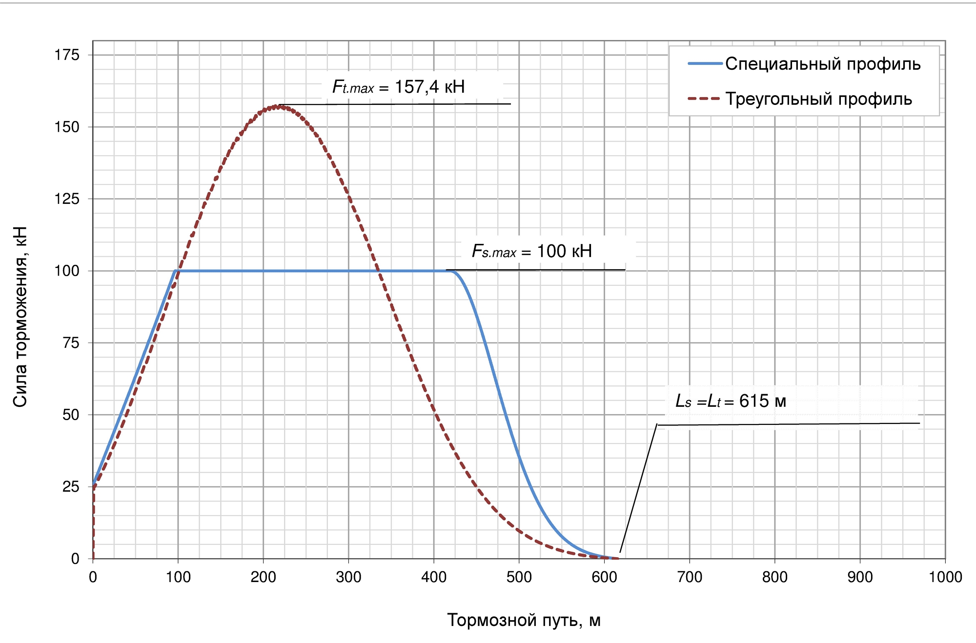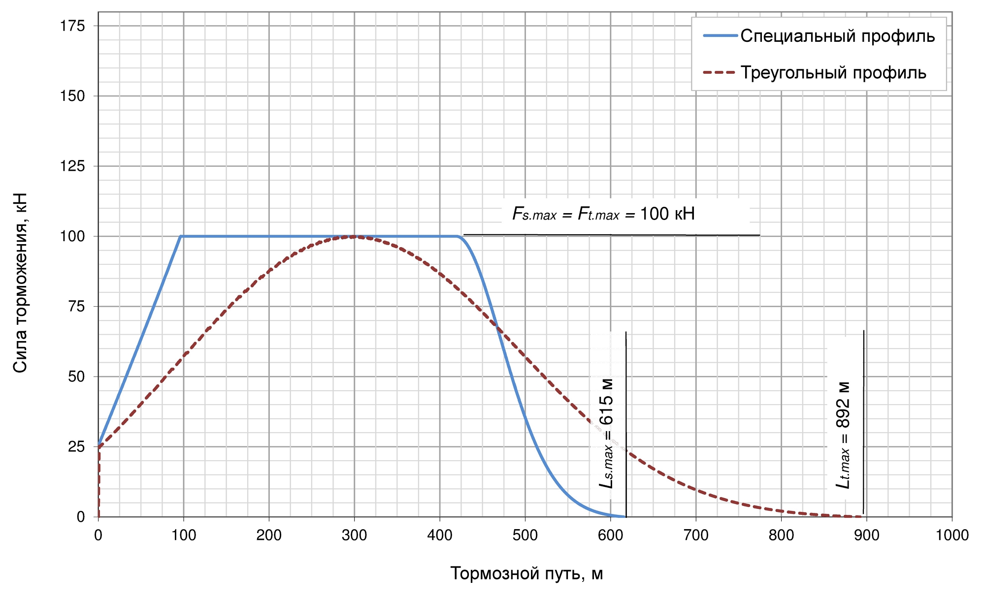 - В втором случае режим торможения имел ограничение по величине тормозной силы. Для данного примера развиваемая тормозная сила не должна превышать 100 кН, что и в случае применения тормоза со специальным профилем.