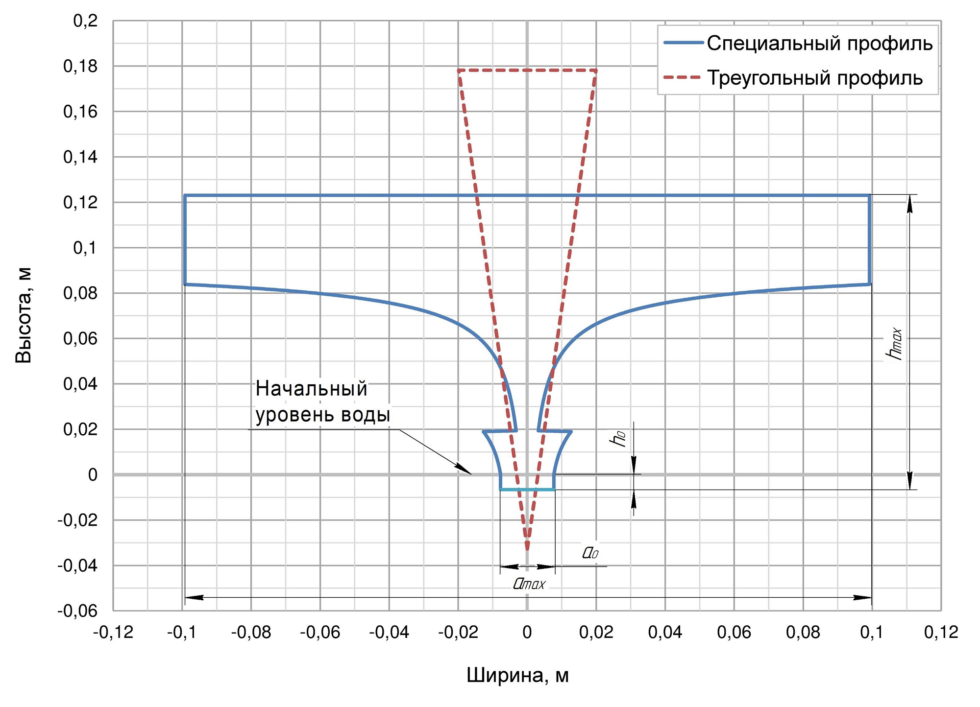 Рис. 4. Контуры специального и треугольного профилей рабочей части тормозного устройства при режиме, ограниченном длиной тормозного пути