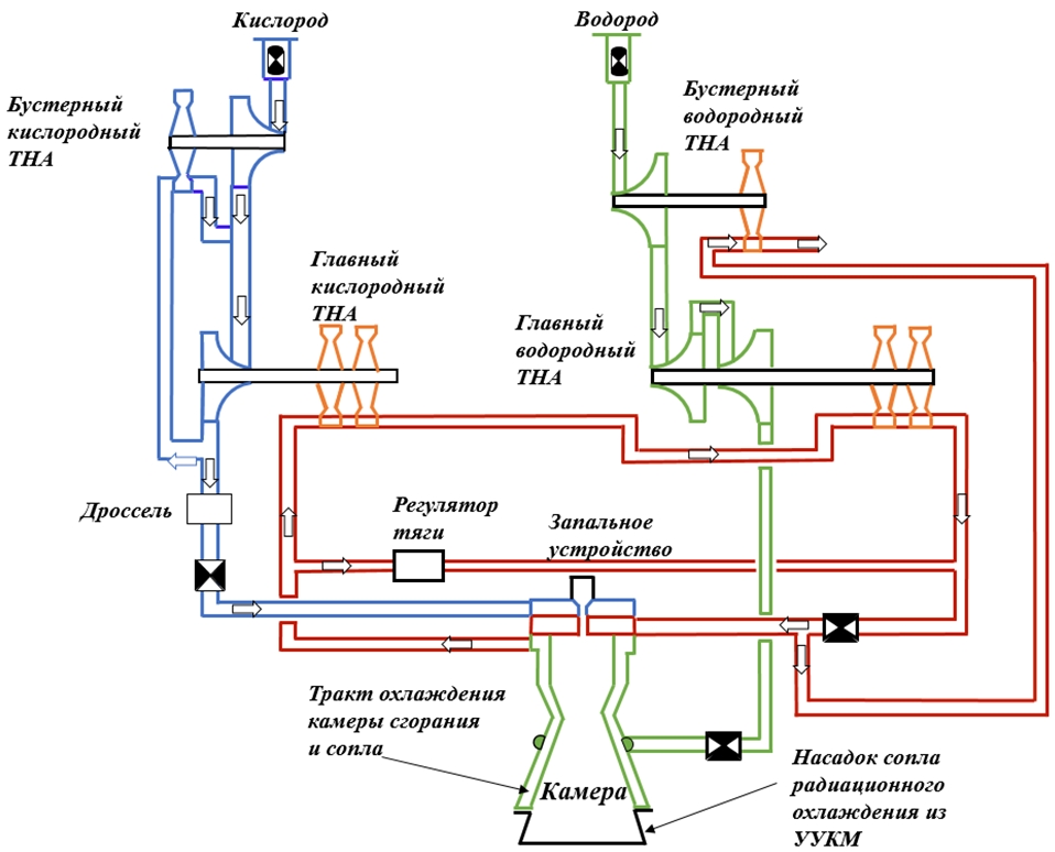 Кислород после баков подаётся в бустерный насос окислителя, затем направляется в основной насос окислителя, после которого часть расхода окислителя идёт на привод бустерной турбины окислителя, а остальная часть расхода – в смесительную головку (СГ).