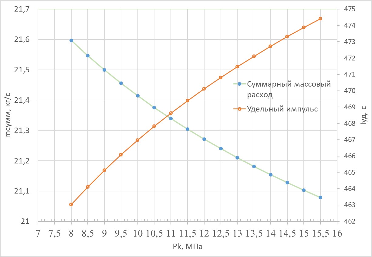 Для данного исследования была написана математическая модель ЖРД, позволяющая оценить геометрические и энергетические параметры двигателя для ряда варьируемых исходных данных. Исследование проводилось при разном давлении в КС, от номинального давления 8 до 15,5 МПа с шагом по давлению 0,5 МПа.