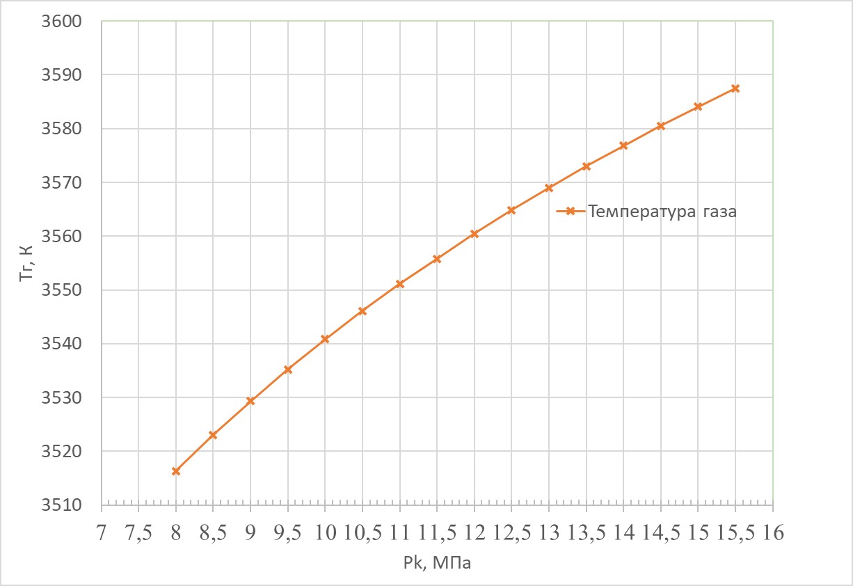 В математической модели учтено изменение температуры ПС от КИО и давления в камере сгорания. На рис. 3. представлена зависимость температуры ПС от давления в КС. Температура увеличивается с 3516 (для давления в КС 8 МПа) до 3587 К (для давления в КС 15,5 МПа).