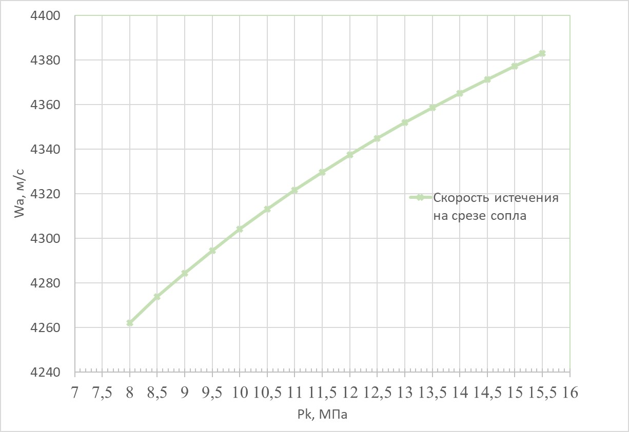 На рис. 4. представлена зависимость скорости истечения на срезе сопла от давления в КС. Согласно проведённым расчётам, скорость истечения на срезе сопла увеличивается от 4262до 4383 м/с.