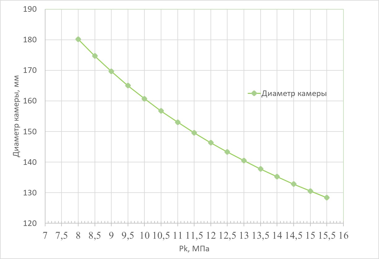 Рис. 5. Зависимость диаметра камеры сгорания от давления в КС