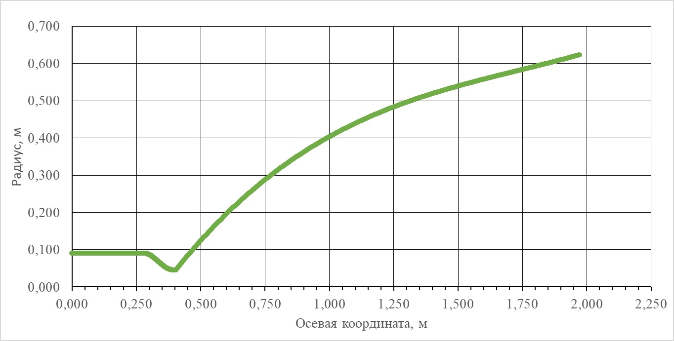 Согласно приведённым зависимостям, можно наблюдать тенденцию изменения геометрии ГДП двигателя. Диаметр камеры уменьшается с 180 до 128,3 мм. Диаметр критики уменьшается с 89,5 до 63,7 мм. Диаметр среза сопла уменьшается с 1244,6 до 1166,9 мм. Длина ГДП двигателя уменьшается с 1972,5 до 1772 мм.