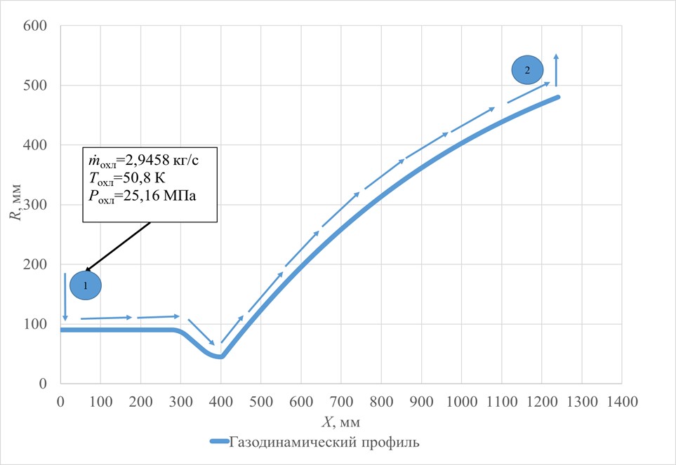 Для дополнительного охлаждения внутренних продольных рёбер ещё холодным водородом была предложена и рассчитана прямоточная схема охлаждения, в которой хладагент подаётся в КС и выходит в районе сечения среза с координатой 1240,7 мм и диаметром 960,59 мм.