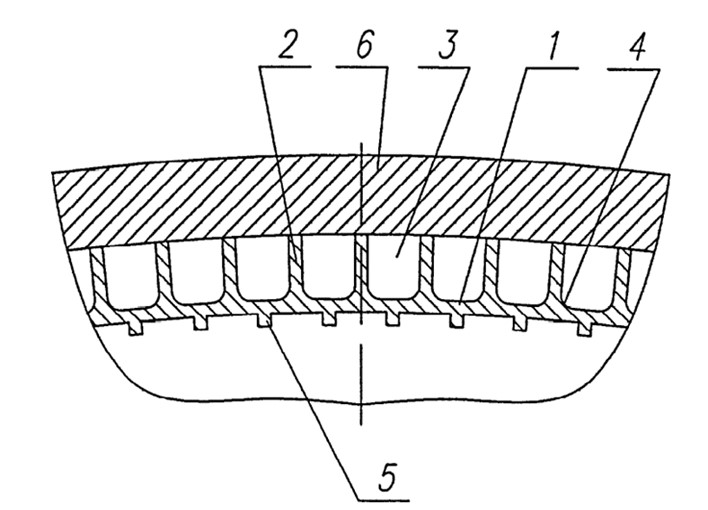 Поперечный разрез камеры сгорания с внутренним оребрением представлен на рис. 11,где 1 – внутренняя оболочка, 2 – основные рёбра ТО, 3 – канал ТО, 4 – скруглённые по радиусу углы, образующие канал ТО, 5 – дополнительные внутренние профилированные рёбра, 6 – наружная профилированная оболочка.