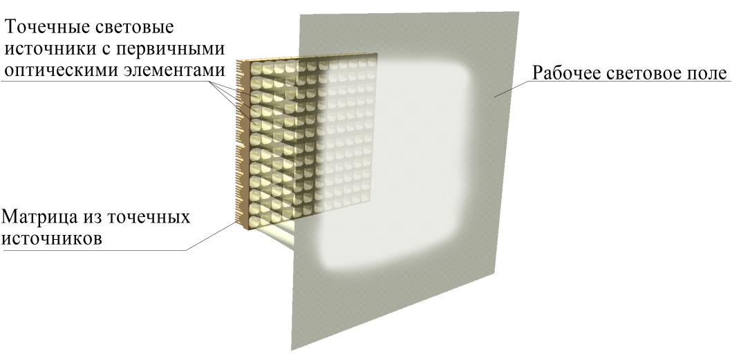 Появление в последнем десятилетии новых разработок высокоэффективных светодиодов делает возможным создание на их основе простого и эффективного ИСИ [6; 7]. В отличие от традиционных, такой ИСИ может быть адаптирован к работе в условиях термовакуумных испытаний, непосредственно в термовакуумной камере [1; 2]. Как один из наиболее рациональных вариантов, в [2] предложена конструкция излучателя ИСИ в виде двухмерного массива (матрицы) с распределенными параметрами из множества точечных световых источников. Каждый такой источник оснащен простым первичным оптическим элементом. В случае, если расстояние до объекта испытаний (ОИ) многократно превышает расстояние между соседними точечными источниками матрицы, их световые потоки, многократно смешиваясь, образуют на ОИ однородное рабочее поле (рис. 1).