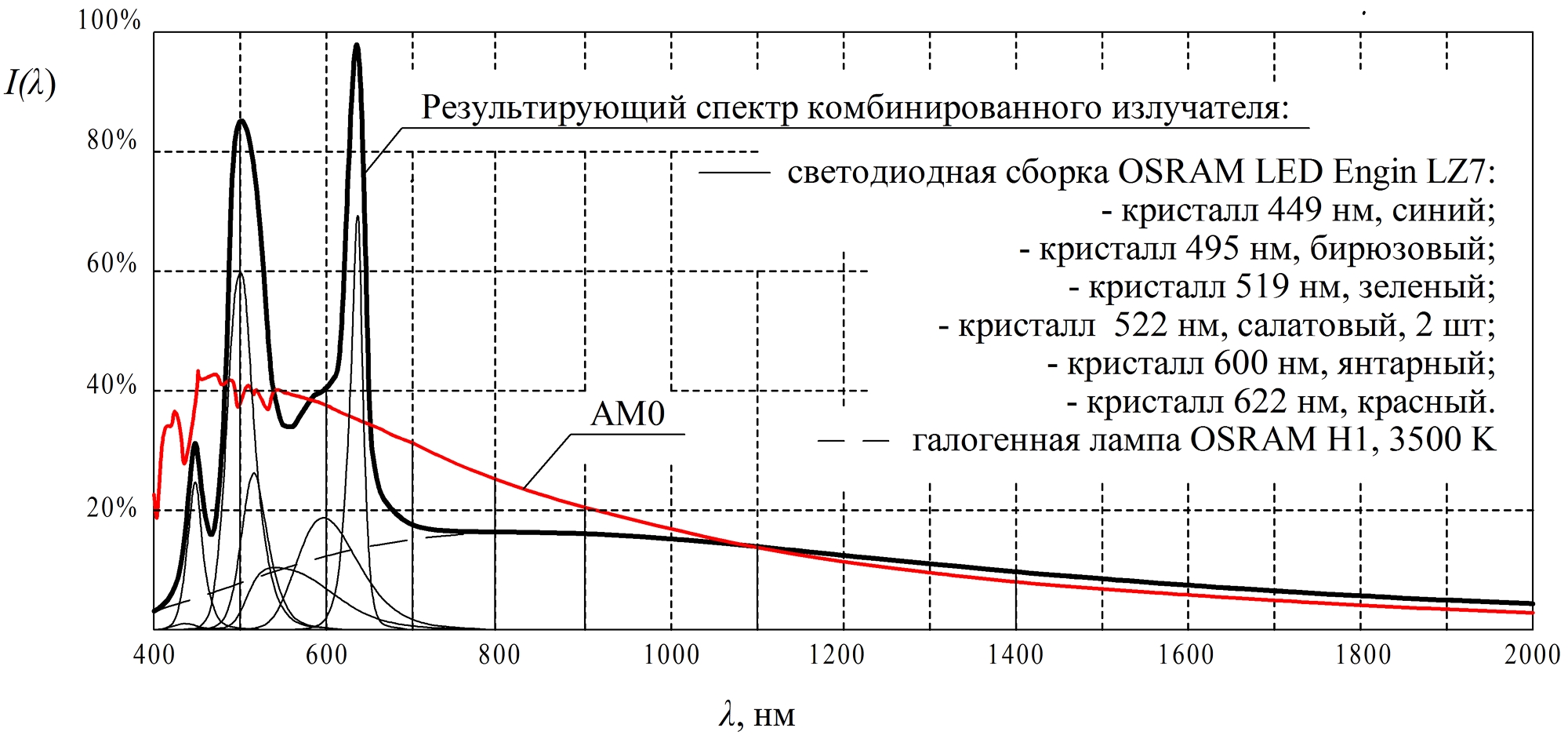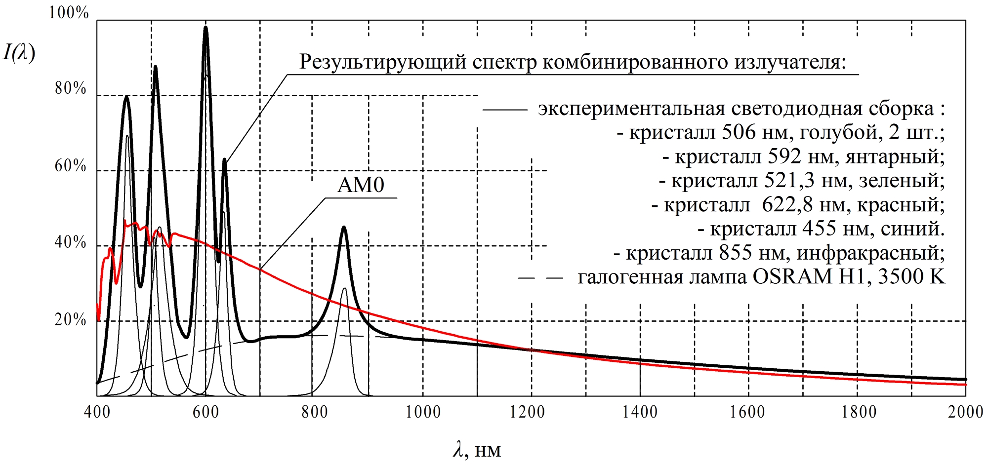 Лучшие результаты получены с экспериментальной светодиодной сборкой, специально разработанной для применения в комбинированном излучателе ИСИ. Спектральное соответствие сохраняется на разных уровнях ЭО, для чего в сборке достаточно пяти кристаллов различных длин волн в видимом диапазоне и одного – в инфракрасном.