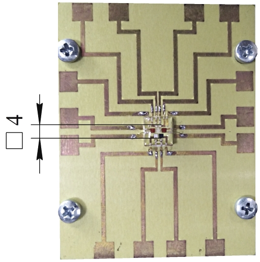 Внешний вид экспериментальной сборки с теплоотводящим основанием показан на рис. 4. Компоновка сборки показана на рис. 5. Размеры излучающей поверхности составляют 4´4 мм. Сборка состоит из семи кристаллов шести длин волн: пяти в видимой области и одной в инфракрасной; питание кристаллов выполнено раздельным. Краткие характеристики составляющих сборку кристаллов приведены в табл. 5.