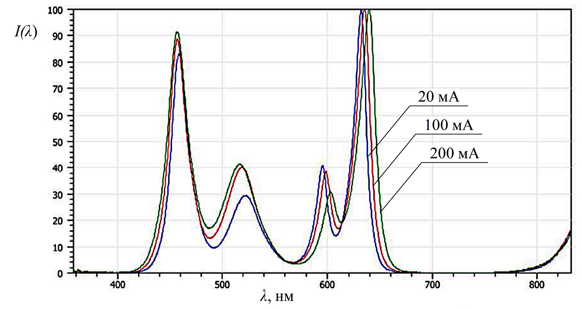 При изменении прямого тока в широких, от 20 до 200 мА, пределах результирующий спектр сборки остается практически неизменным (рис. 7).