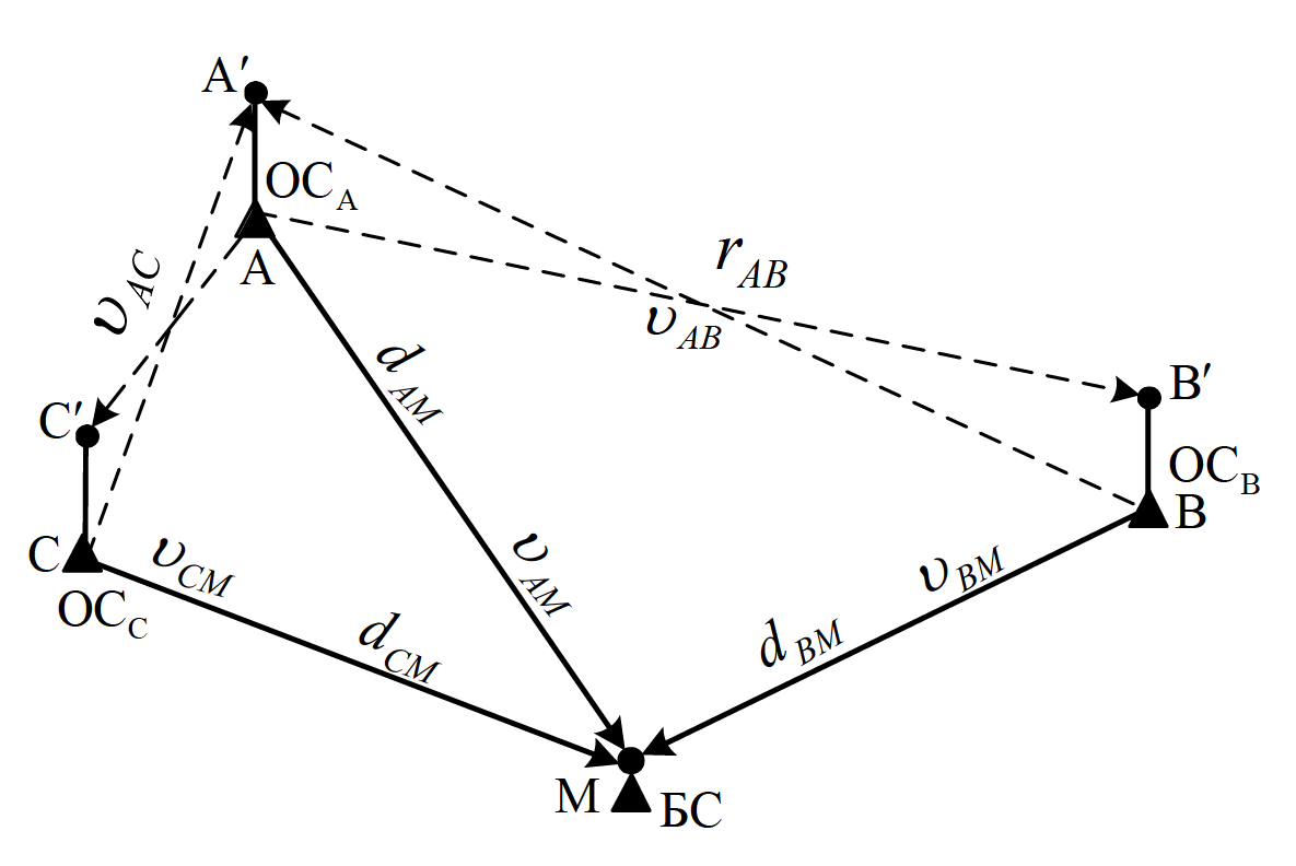 Координаты расположения БС (рис. 1, пункт М) можно определить путем решения системы трех уравнений для квазидальностей, отличающихся от геометрических дальностей (dAM, dBM и dCM, рис. 1) на величину, пропорциональную расхождению шкал времени (ΔtB и ΔtC) и системной шкалы времени (ΔtM, рис. 3) при скоростях (vAM, vBM и vCM) распространения сигналов, которые могут быть определены по метеопараметрам [14], соответствующим трассам (AM, BM и CM) распространения сигналов, в форме