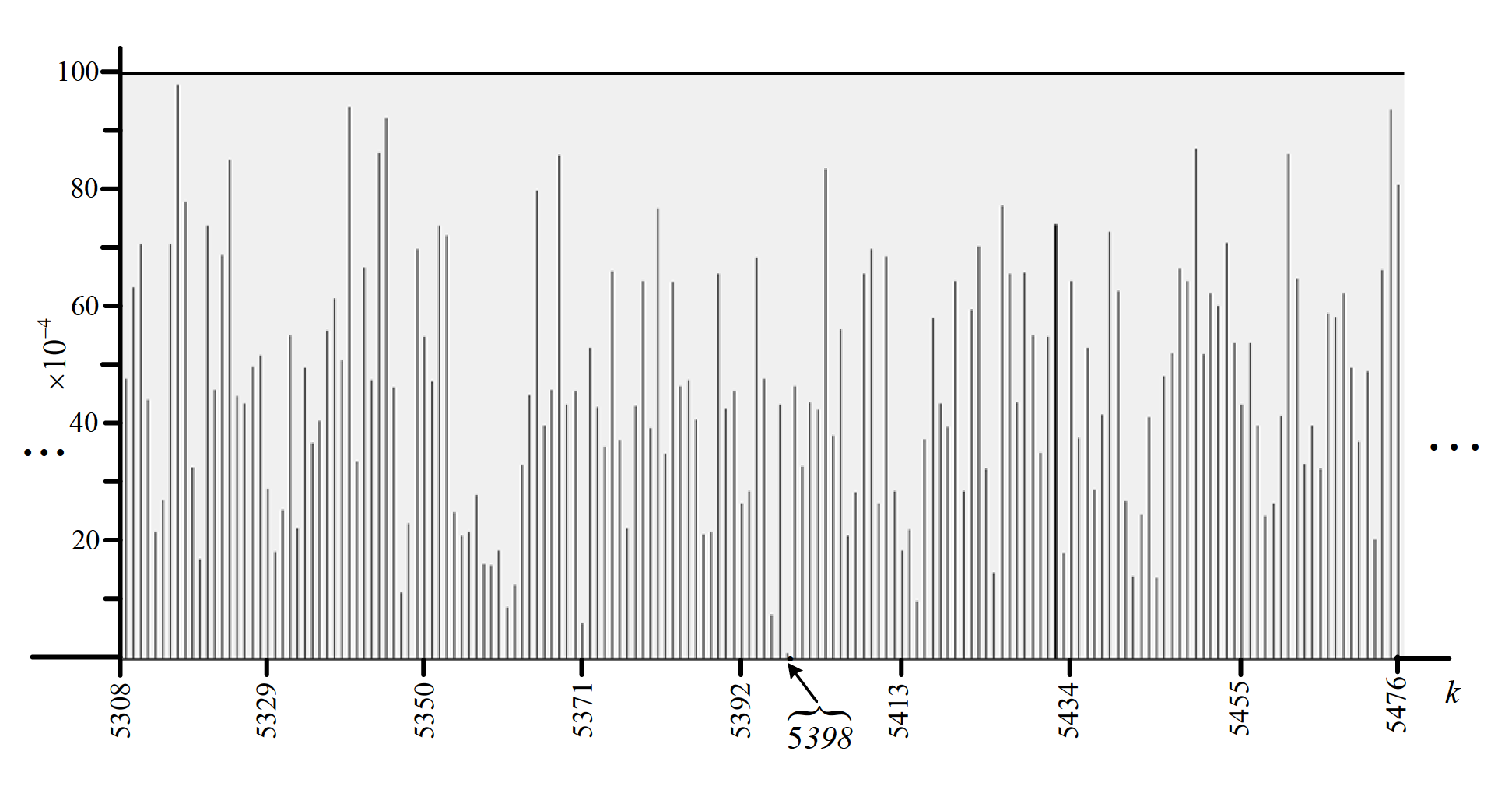 Кроме того, дополнительная развязка обеспечивается за счёт использования кодового разделения излучаемого сигнала sA(t, di) (di модулирующий код ПСП) опорной станцией ОСА и принимаемого сигнала sB(t - τp, di n) (di n - модулирующий код di ПСП с n циклическим сдвигом) от опорной станции ОСВ. Величина задержки τp распространения ЭМВ на трассе АВ определяется скоростью υAB распространения поверхностной электромагнитной волны в свободном пространстве [11] и выбранным расстоянием rAB между опорными станциями. В данном случае, кодовое разделение предполагает вычисление значения взаимной корреляции сигналов sA(t, di ) и sB (t - τр, di n). Как выше было показано, второй сигнал отличается от первого модулирующим кодом, соответствующему циклическому сдвигу на n двоичных символов и тогда необходимо вычислить значение автокорреляции сигналов sA (t, di ) и sB (t - τр, di n) при их относительной задержке τ = τР + nτэ ( τэ - длительность символа в коде ПСП). Необходимо также учесть использование дополнительной кодовой ФМ на указанные сигналы. По формулам [12] для МЧМ-сигнала с модулирующим M-кодом ПСП длины L = 214 - 1 = 16383 и с дополнительной ФМ получен график модуля нормированной периодической (T = Lτэ - период) автокорреляционной функции (ПАКФ) от относительного числа задержки k ( k = [τ / τэ] - (целое число сдвигов на длительность символов ПСП). На рис. 2 представлен график сегмента (с целью получения высокого разрешения) модуля нормированной ПАКФ при ФМ на интервале [5308, 5476] числа сдвигов. Как видно из рис. 2, при задержке 5398τэ возможно минимальное значение – 1 /L ≃ 10-4. Если опорные станции удалены друг от друга на расстояние rAB = 300 км, то при этом задержка распространения сигнала составит τp ≃ 1 мс (используя скорость υAB ≃3·108 м/c, совершаем ошибку порядка 0,1 %) и при τэ = 2.5 · 10-6 с будет соответствовать задержке kз = rAB / (υABτэ) на 400 двоичных символов ПСП. Согласно рис. 2, чтобы обеспечить минимальное значение модуля нормированной ПАКФ (для k = 5398), необходимо использовать модулирующий код ПСП опорной станции ОСВ с циклическим сдвигом на nB = 4998 = 5398 – 400 символов. Можно сказать, что сигналы sA(t, di) и sB(t - τр, di n) в пункте их обработки (а также в точках, принадлежащих поверхности круга, радиусом τэυAB / 2 ≈ 350 м, с центром расположения приёмно-излучающей антенны) будут существенно разделены, что эквивалентно обеспечению дополнительной развязке антенн не более 42 дБ ≃ 10 lg(1/ L) .
