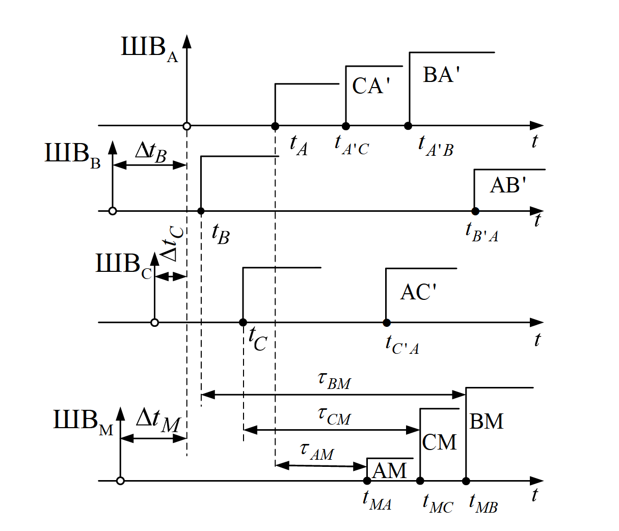 На рис. 3 изображены временные диаграммы, соответствующие моментам приёма и излучения сигналов РНС при действующих шкалах времени (ШВ*). Шкала времени каждой из ОС представляет собой непрерывную последовательность интервалов, равных длительности Lτэ сигнала, отсчитываемых от начала момента t = 0 времени. Шкалы времени, у которых на любом интервале длительности сигнала начальные фазы и комплексные огибающие сигналов совпадают с требуемой точностью, называются синхронными [2] и в течение измерения навигационных параметров необходимо поддерживать эту синхронность. В нашем случае в моменты времени tA, tB и tC опорные станции ОСА, ОСВ и ОСС излучают радиосигналы относительно собственных шкал времени (ШВА, ШВВ, ШВС) и моменты t* времени не равны нулю. Это обусловлено тем, что в инерционных цепях формирования высокочастотного сигнала возникает групповое запаздывание, что приводит к отставанию момента излучения «заданной» фазы модулирующего кода относительно момента его формирования в генераторе кода и, соответственно, к отличию действительного момента излучения относительно того, которое передаётся в навигационном сообщении [13]. В связи с идентичностью исполнения формирователей радиосигналов, это время для всех ОС одинаково, т. е. tA = tB = tC относительно собственных шкал времени (ШВА, ШВВ и ШВС).