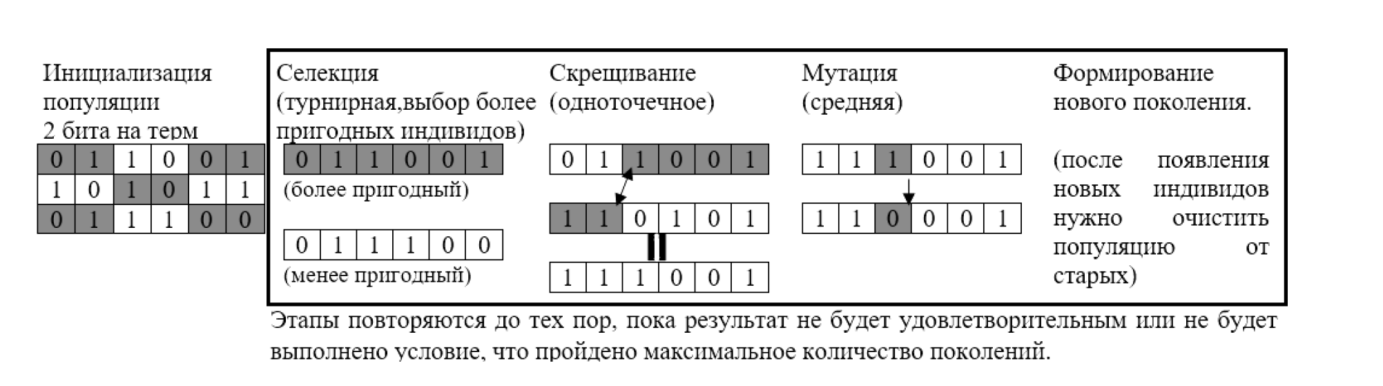 Генетические алгоритмы входят в состав эволюционных алгоритмов поиска, которые объединяют различные варианты использования эволюционных принципов для достижения поставленной цели. ГА позволяют осуществлять поиск оптимального решения для широкого списка прикладных решений. ГА делится на несколько этапов: инициализация популяции, селекция, скрещивание, мутация и формирование нового поколения [9]. Процесс поиска начинается с набора индивидов или же с популяции. Индивид характеризуется набором параметров (переменных), известных как гены. Гены объединяются в цепочку, образуя хромосому. Размер хромосомы может меняться в зависимости, как например, в данной работе, от количества термов или классов. Определить количество битов на хромосому можно по формуле (1)