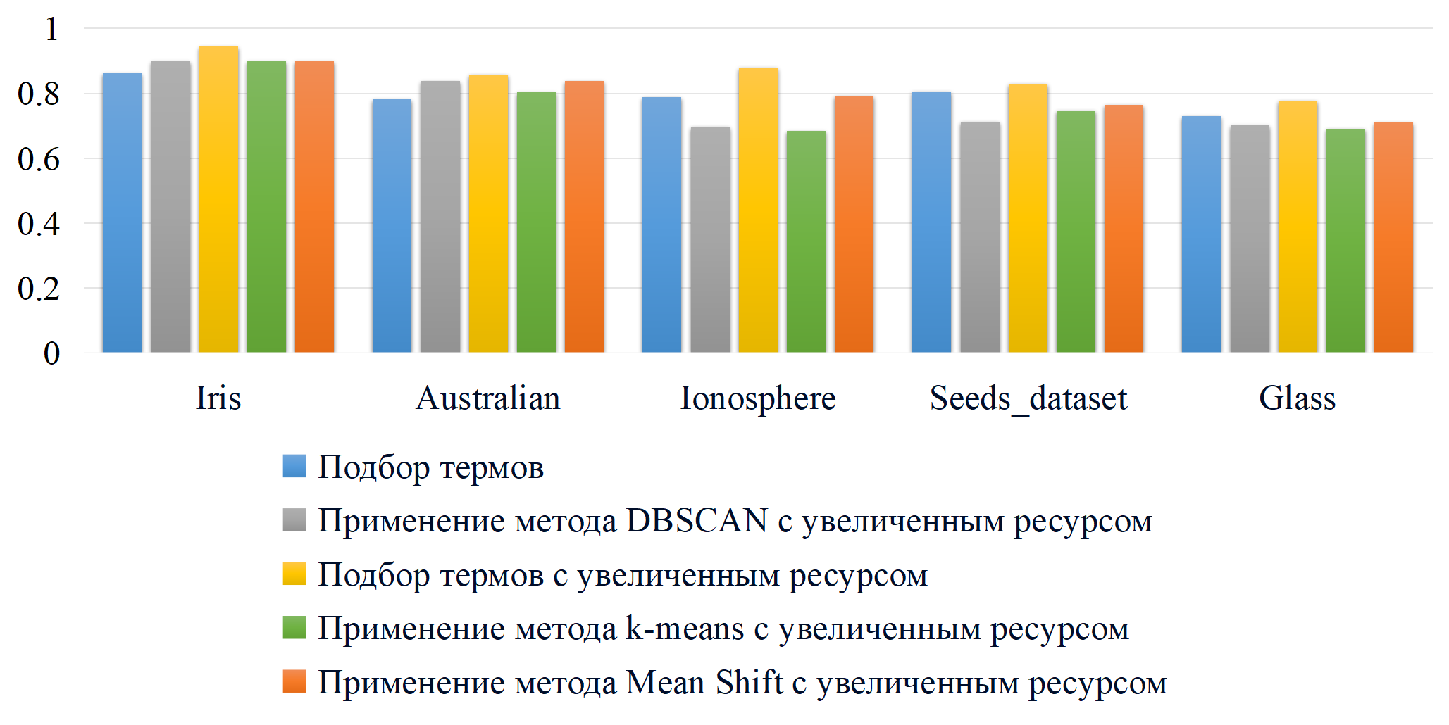 По результатам, представленным в табл. 4 и на рис. 4, можно сделать вывод, что метод Mean Shift точнее предсказывает количество термов для различного набора данных. Методы DBSCAN и k-средних уступают на некоторых выборках.