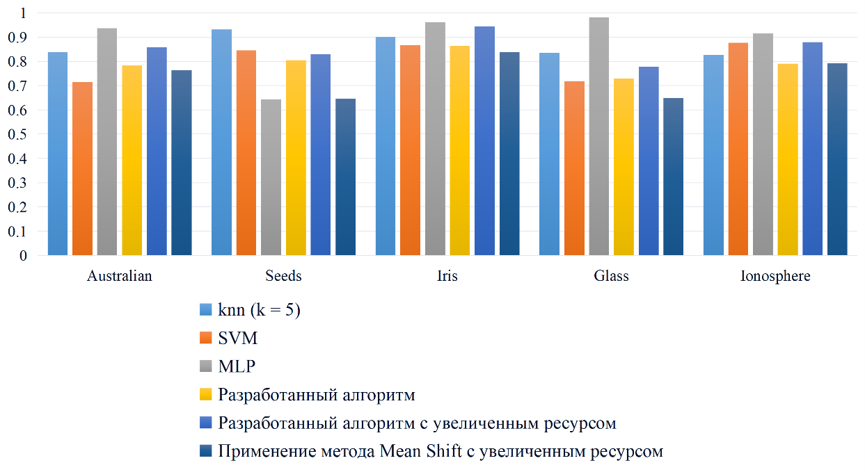 Анализируя данные, представленные на рис. 5, можно сделать вывод, что предлагаемый разработанный алгоритм уступает по точности методам MLP и k-ближайших соседей, но на некоторых наборах данных лучше метода SVM или сравним с ним. Но при увеличении объемаресурсов как минимум до 300 индивидов алгоритм показывает более высокие результаты. Применение метода Mean Shift уступает в точности разработанному алгоритму, но автоматизирует определение количества термов для различных выборок.