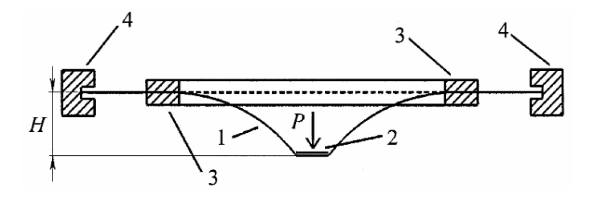 Fig. 3. Device for determining the tension of the mesh by the method of local deformation of the membrane: 1 – the membrane; 2 – the platform on which the load is distributed; 3 – the clamping rings; 4 – the outer boundary of the membrane