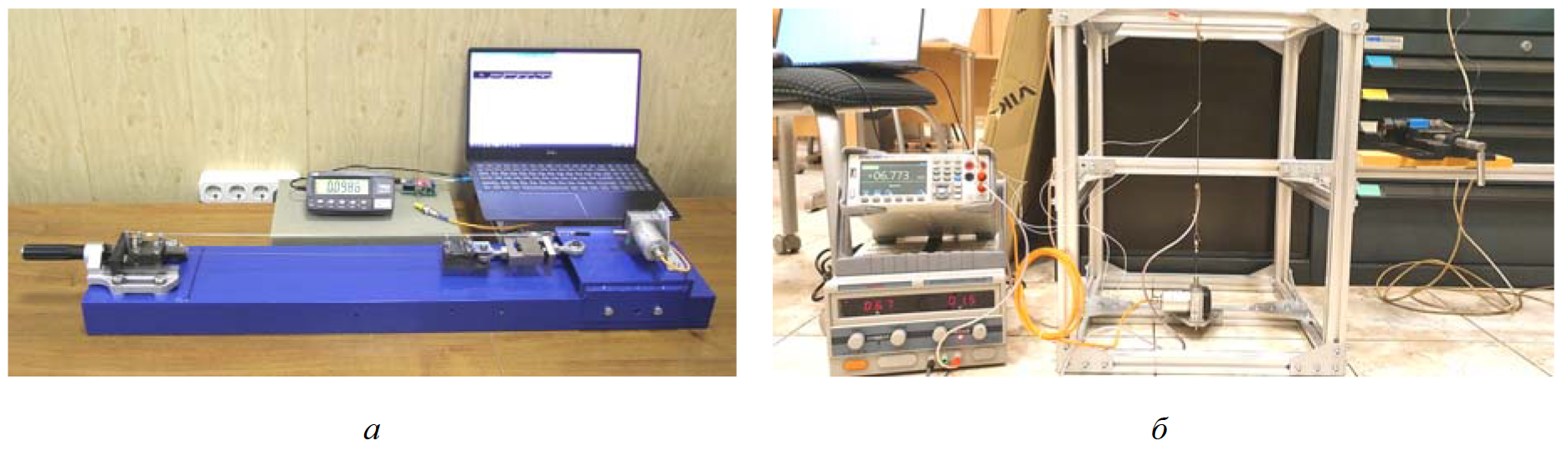 Активные элементы предварительно подвергались различным видам температурной обработки. Термообработка проводилась с целью устранения возможных внутренних напряжений. На этом этапе температура нагрева печи варьировалась от 450 до 850 ºС. Время термообработки активных элементов варьировалось от 30 до 60 мин, при этом охлаждение происходило в печи. Далее к активному элементу прикладывалось растягивающее усилие, которое создавало в его сечениях растягивающее напряжение. Затем активный элемент нагревался путем пропускания через него электрического тока. Температура активного элемента в момент начала сокращения им своей длины составляла порядка 70–80 ºС. Для оценки стабильности параметров активного элемента силового привода, таких как рабочий ход (уменьшение относительного удлинения активного элемента) и усилие срабатывания (усилие, создаваемое активным элементом), были проведены следующие испытания. К активному элементу прикладывалось растягивающее усилие (рис. 2, а). Далее активный элемент нагревался. Нагрев активного элемента после деформирования проводился на экспериментальной установке, представленной на рис. 2, б.
