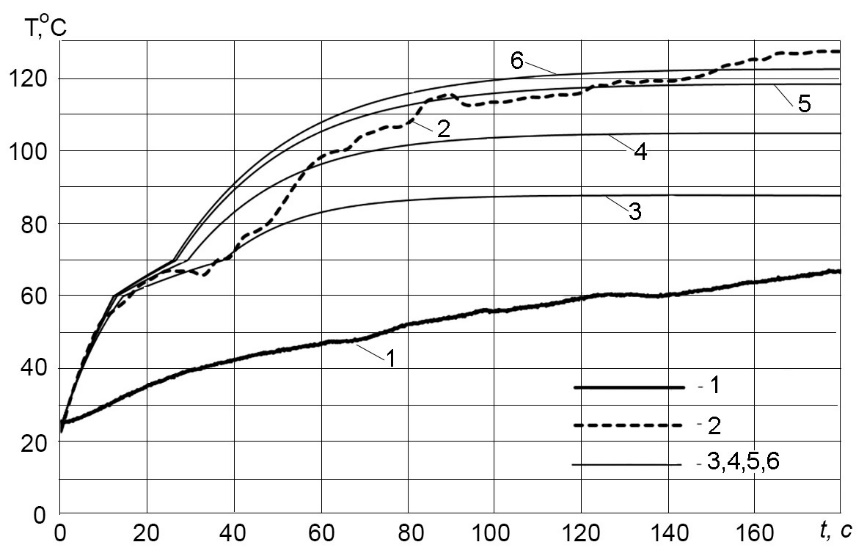 Fig. 3. Test results and numerical calculations of the temperature change of the active element: 1 – when measured by a thermocouple; 2 – when measured by a thermal imager; 3–6 – calculated with heat transfer coefficients a equal to 70, 55, 47 and 45