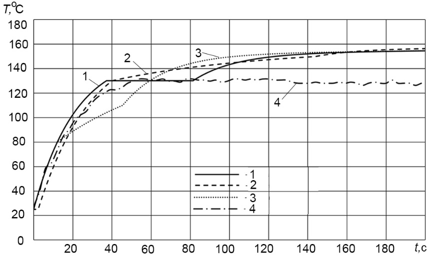 Рис. 4. Результаты испытаний и численных расчетов: 1, 2 – при расчетных значениях коэффициента k, равных 1; 0,5; 3 – изменение теплоемкости активного элемента; 4 – при измерении температуры активного элемента тепловизором