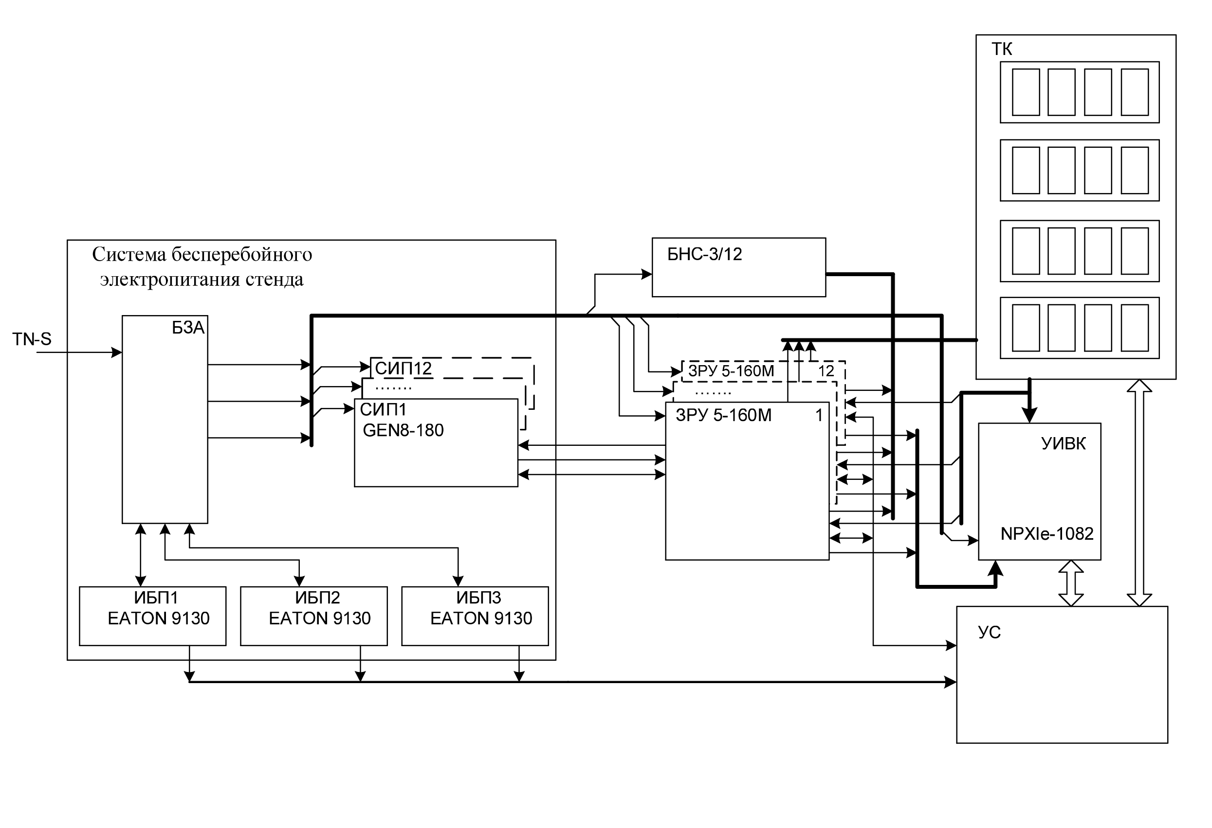 Также в блоке нагрузок стенда БНС-30 расположено устройство распределения электропитания от ИБП EATON 9130 между УИВК, двенадцатью ЗРУ 160-5 и двенадцатью соединенных с ними СИП LAMBDA GEN 8-180.