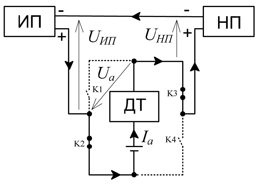 Поэтому авторами была разработана новая структура зарядно-разрядного устройства – ЗРУ 160–5 [13; 15; 16]. В предлагаемой схеме (рис. 2) ЗУ и РУ объединены в одно устройство, содержащее источник бесперебойного питания, регулируемый стабилизирующий источник питания (СИП), трёхпозиционный коммутатор, оригинальный управляемый нагрузочный преобразователь (НП) рекуперативного типа [14]. Аккумулятор (А), последовательно соединенный с датчиком тока (ДТ) аккумулятора, включён в диагональ коммутатора, образованного мостовой схемой из полупроводниковых ключей К1 – К4. НП в режиме стабилизации тока стабилизирует и регулирует токи заряда/разряда в требуемом диапазоне. В режиме стабилизации мощности и режиме заряда со стабилизацией напряжения ЛИА величина тока вычисляется с учетом измеренного напряжения ЛИА.