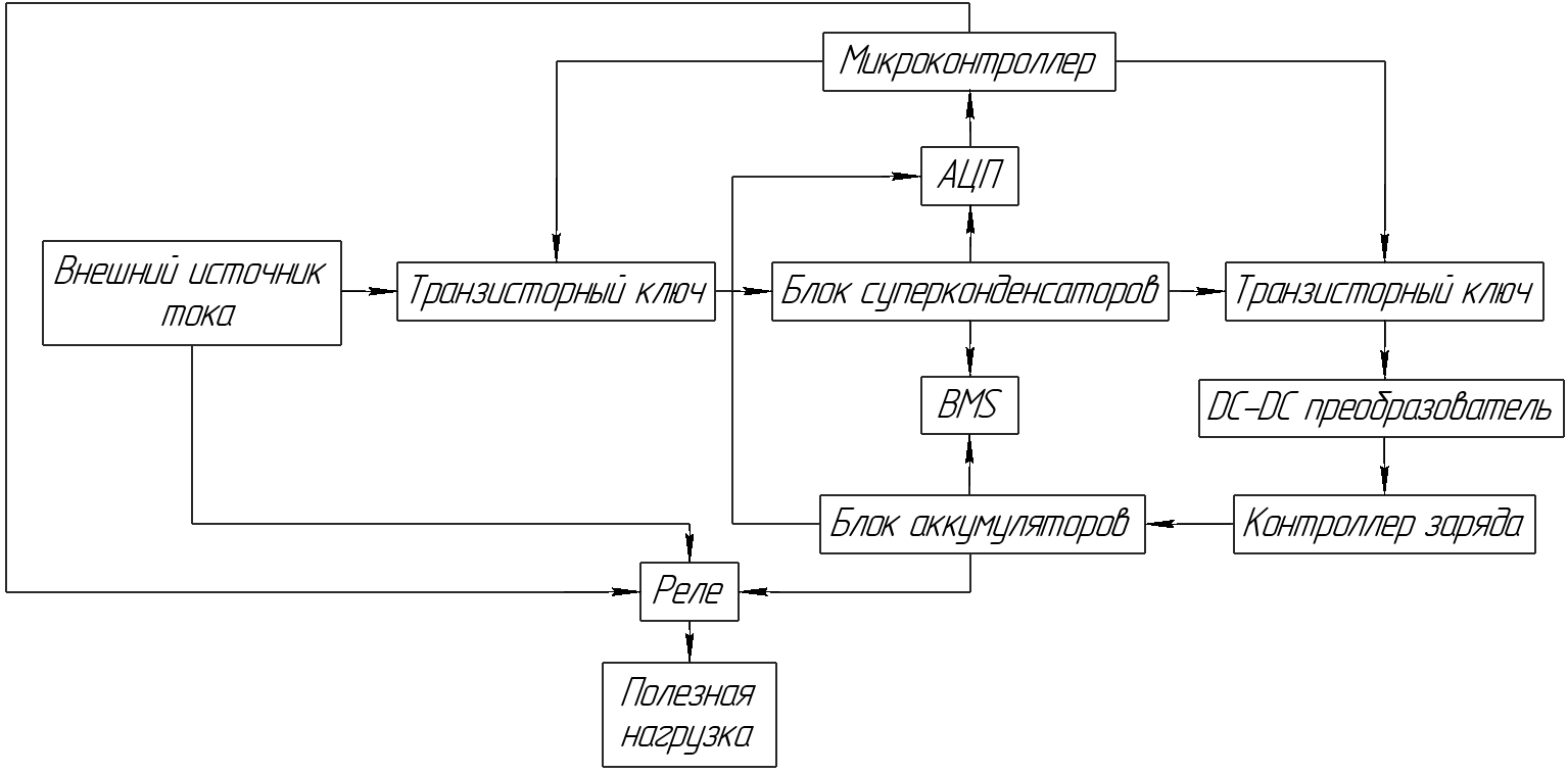 Принцип работы схемы заключается в следующем: зарядка начинается с накопления электроэнергии блоком последовательно соединённых суперконденсаторов от внешнего источника тока до требуемого напряжения, после чего происходит раскоммутация цепи внешнего источника тока от блока суперконденсаторов; далее, проходит зарядка блока аккумуляторов от суперконденсаторов через промежуточный DC-DC преобразователь и контроллер заряда, необходимый для обеспечения оптимального метода заряда аккумуляторов [6; 7]. Так как емкость ионисторов значительно меньше аккумуляторов, зарядка носит циклический характер до тех пор, пока на аккумуляторах не будет достигнуто требуемое напряжение или уровень заряда. Питание нагрузки осуществляется непосредственно от блока аккумуляторов либо через внешний источник тока, где для переключения между двумя источниками питания применяется реле, состояние которого задается микроконтроллером. Управление зарядкой осуществляется транзисторами, работающими в ключевом режиме и осуществляющими коммутацию цепи между аккумулятором, суперконденсатором и внешнем источником тока. Управление транзисторами и реле осуществляется через микроконтроллер. Аналого-цифровой преобразователь (АЦП) используется для мониторинга напряжений на одном аккумуляторе и суперконденсаторе, с последующей передачей информации на микроконтроллер.
