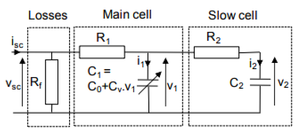 Модель суперконденсатора содержит два ветви, состоящие из конденсаторов и резисторов, – медленную и главную, соединенные параллельно (рис. 4). Таким образом, напряжение на них всегда одинаковое, а токи проходят между собой пропорционально резисторам R1, R2 и Rf, чтобы учесть потери [13].
