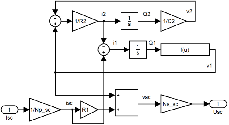 Для того чтобы получить на выходе напряжение, в главном суперконденсаторе осуществляется умножение значения тока на входе с сопротивлением R1. Однако это лишь напряжение на входе суперконденсаторов, соединённых параллельно, а для ячеек, соединённых последовательно, выходное значение умножается на Ns_sc, где Ns_sc – это количество последовательно соединённых суперконденсаторов. Таким образом, напряжение суперконденсатора высчитывается из формулы (2):