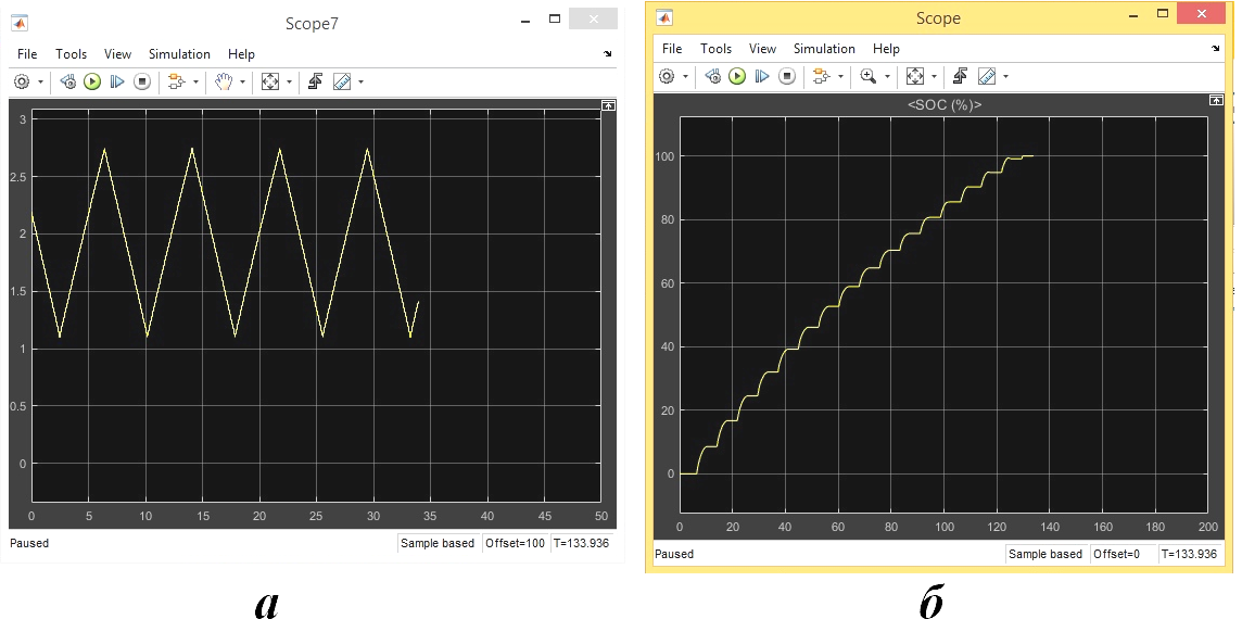 На основании результатов моделирования (рис. 6), можно сделать вывод о работоспособности математической модели. При зарядке блока суперконденсаторов происходит пауза: аккумулятор не заряжается. В случае разрядки суперконденсаторов, проходит зарядка модели аккумулятора.