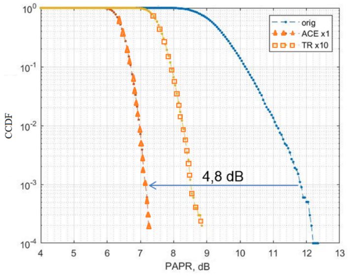 Моделирование OFDM размером БПФ 2048 точек c модуляцией QPSK, снижает пик-фактор до 7,2 дБ относительно исходного сигнала с пик фактором 12 дБ с вероятностью 10–3 присовместном использовании алгоритмов TR (Tone Reservation) и ACE (Active Constellation Extension). Таким образом, выигрыш от применения алгоритма уменьшения пик-фактора составил 4,8 дБ.